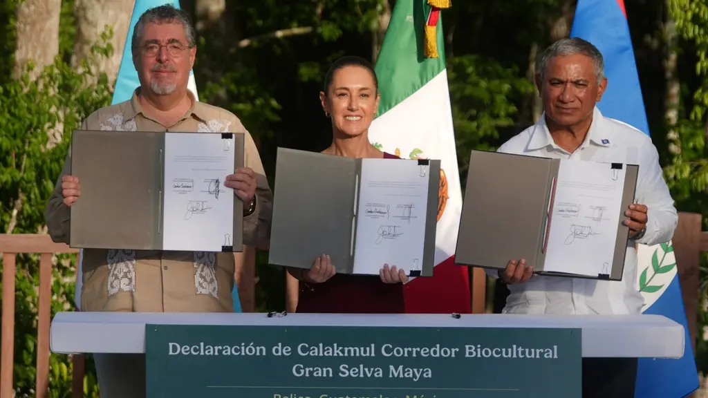 La dra. Sheinbaum, el presidente Arévalo y el Primer Ministro Briseño se reunieron para revisar desde el aspecto migratorio hasta la ampliación del Tren Maya, teniendo como fondo las estupendas ruinas de Calakmul.