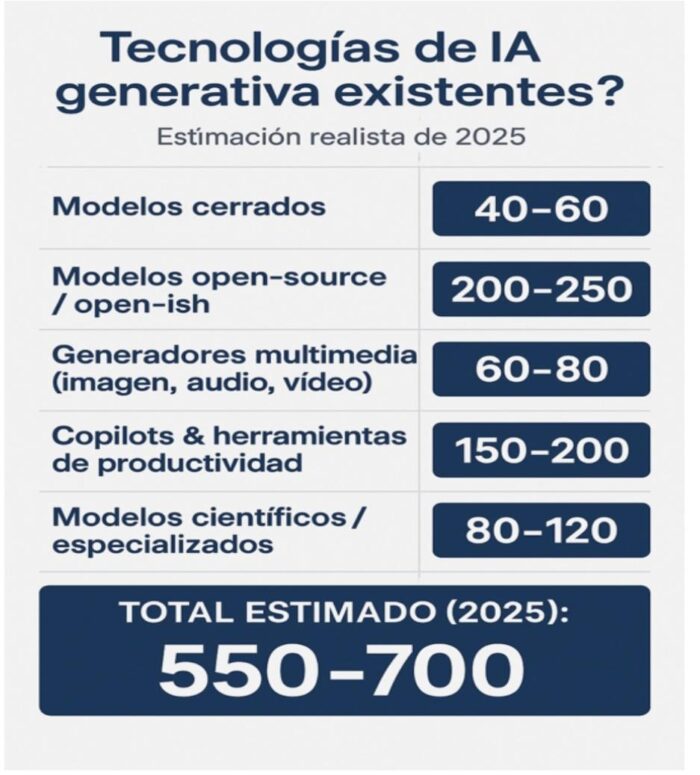 En paralelo, docenas de modelos open-source (Mistral 7B, familias Mistral Large, etc.) y servicios nicho aparecen y evolucionan casi cada trimestre.