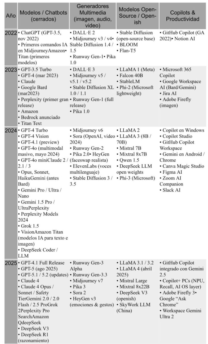 LÍNEA DE TIEMPO 2022–2025: MODELOS, APPS Y TSUNAMIS DE HYPE