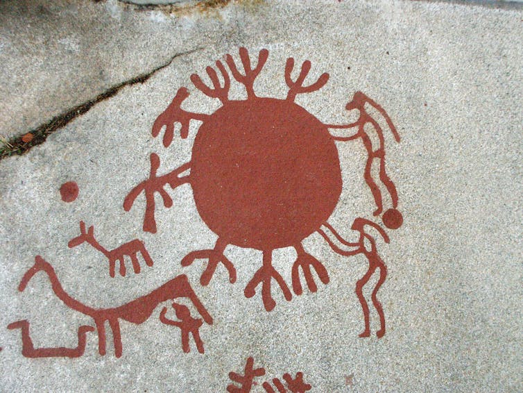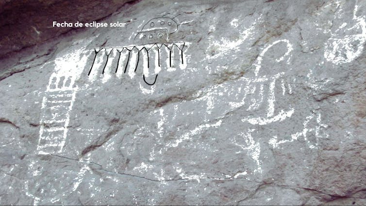 Hay una figura muy similar en el Cañón de Chaco, en Estados Unidos. Este conjunto pictórico se ha propuesto como el eclipse de julio de 1907. Incluso se pintó la llamada corona o anillo solar que se proyecta cuando la Luna cubre la luz brillante del Sol. Según el astrónomo McKim Malville, de la Universidad de Colorado Boulder, experto en arqueoastronomía, quien descubrió el petroglifo en 1992, “no parece simbolizar un momento temible”.