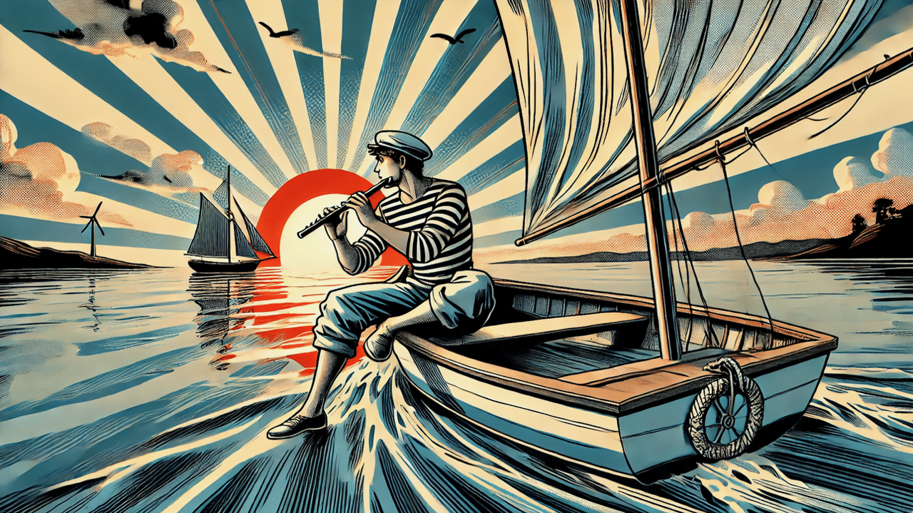 Llamó mi atención una melodía que con notas agudas salía de una flauta, la típica flauta escolar, supongo. Al escuchar la música pasó un bote tan cerca de nosotros que pudimos distinguir en su popa a un “marinero músico” que vestía una camiseta a rayas horizontales blancas y azules, de cabello castaño con rizos, un sombrerito de tela negra lo coronaba. Su pierna derecha estaba recargada en el casco del barco y sus manos muy dispuestas tocaban los acordes del instrumento musical.