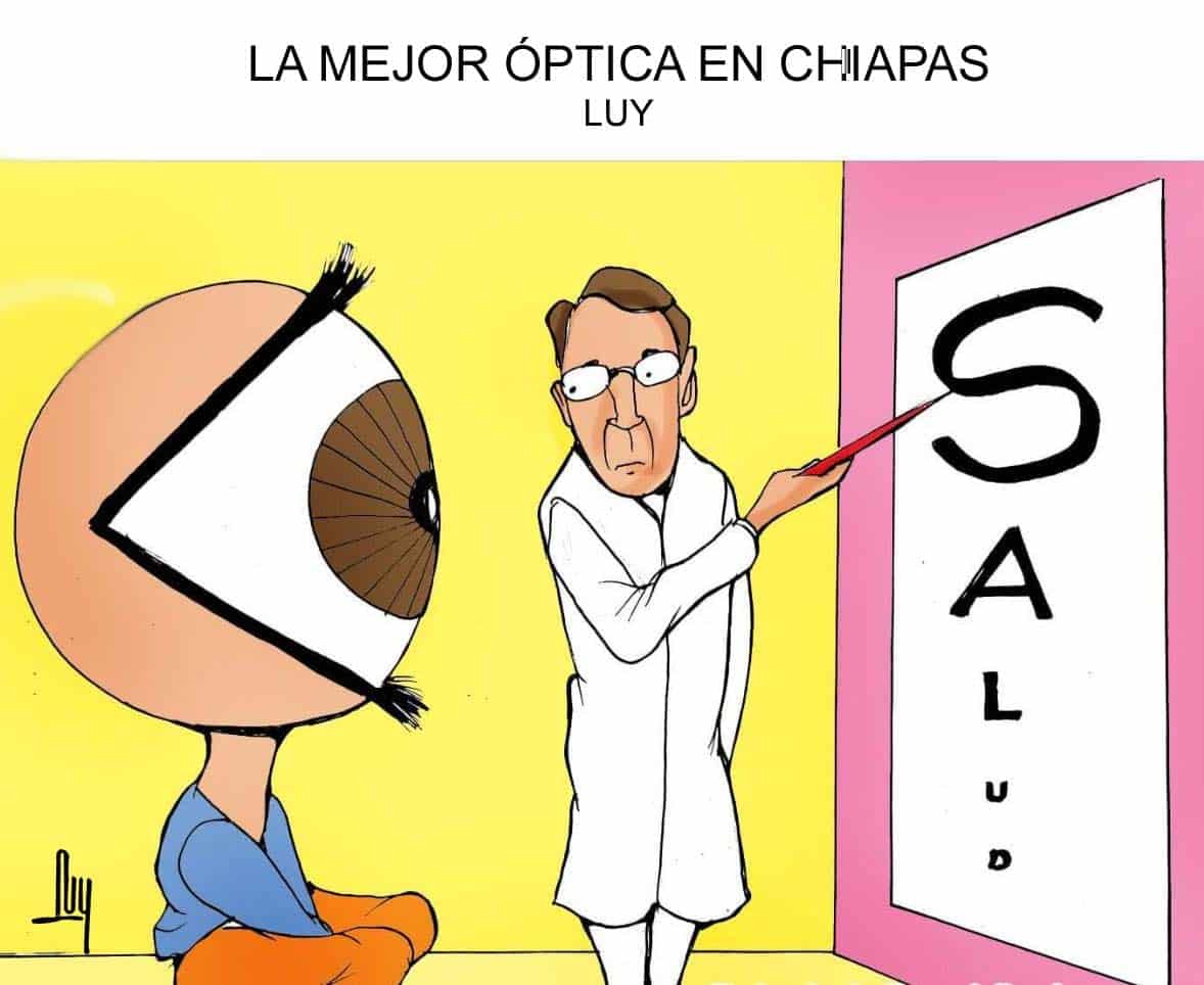 Cartoon eye character sits facing a doctor in a white coat who points at a vertical sign reading SALUD in a pink doorway, suggesting eye care.