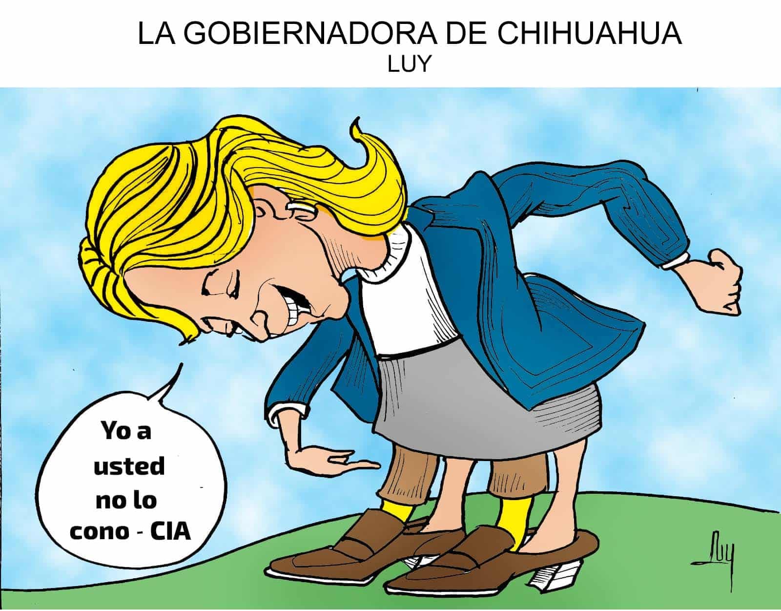 Cartoon of the Chihuahua governor, Luy, bending forward with a speech bubble containing Spanish text on a blue sky background.