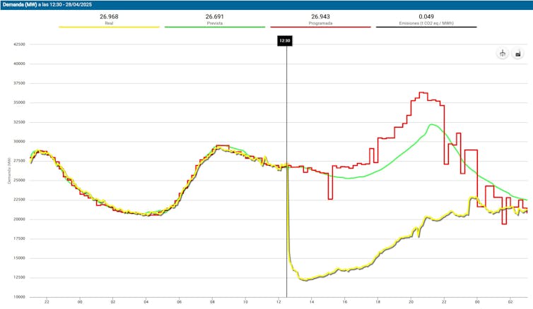 El lunes 28 de abril todo parecía transcurrir con normalidad en el sistema eléctrico peninsular español. La demanda de electricidad era la habitual para esta época del año, claramente inferior a la capacidad total de generación disponible.