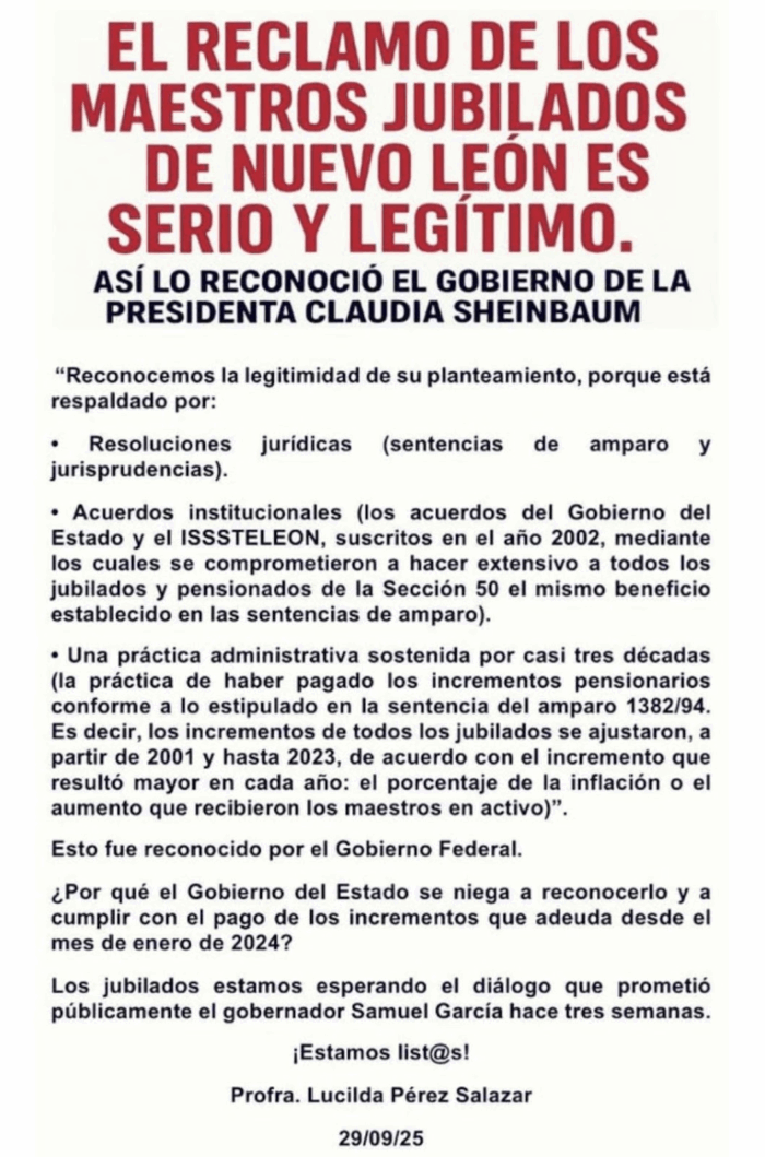 Solicitaron también una audiencia con la presidenta Claudia Sheinbaum, pero no ha habido respuesta hasta el día de hoy: 15 mil docentes jubilados en Nuevo León. La pensión es parte del sustento de los maestros Jubilados.